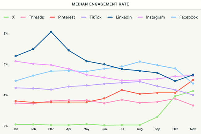 Medan engagemanget i fjol ökade på plattformar som X (+44 %), Pinterest (+23 %) och Facebook (+11 %), var det stabilt på TikTok och minskade på Instagram (-26 %), Threads (-18 %) och LinkedIn (-5 %).