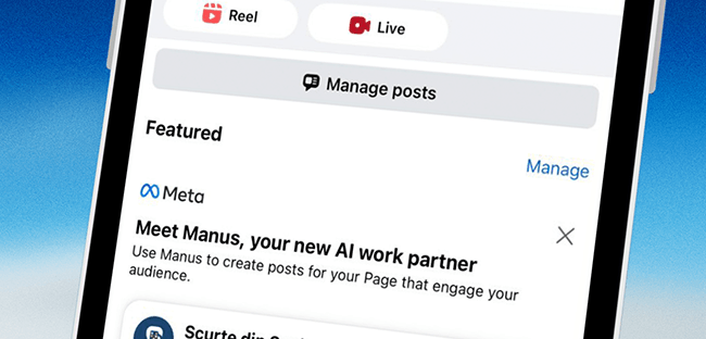 Facebook testar möjligheten att automatisera skapandet av inlägg på Facebook-sidor med hjälp av AI-agenten Manus.