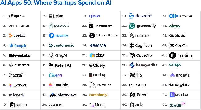 Uppstartsbolag spenderar mest pengar på AI-verktyg från OpenAI, följt av Anthropic och Replit. Det visar en ny rapport från riskkapitalbolaget Andreessen Horowitz. Horisontella appar – som generella assistenter och anteckningsverktyg – står för omkring 60 procent av utgifterna på AI-verktyg, medan resten går till vertikala lösningar som används för kundservice, HR och juridiska tjänster.