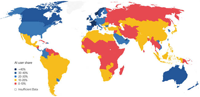 Siffrorna baseras på faktisk användning av Microsofts AI-verktyg, justerad för hur stor andel av befolkningen som har tillgång till datorer, smarttelefoner, internet och andra AI-tjänster.