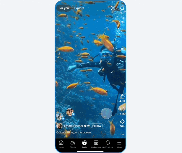 Facebook rullar ut 'vänbubblor' som visar vilka Reels dina vänner har gillat. Du kan trycka på bubblan för att starta en chatt direkt från videon. Samtidigt lanserar Facebook AI-baserade sökförslag för Reels och kommer att visa 50 procent fler Reels från kreatörer som publicerat samma dag. Längre Reels – över en minut – står nu för mer än hälften av tittartiden.