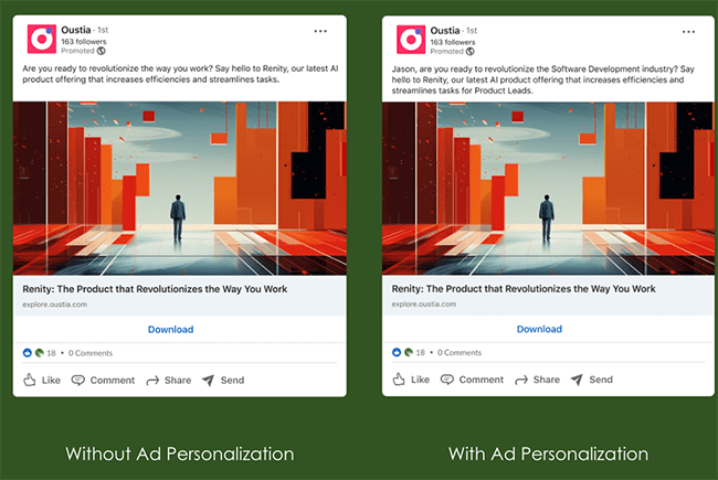 Personanpassade annonser: Anpassar annonstexten automatiskt utifrån användarens namn, jobbtitel, bransch och företag.