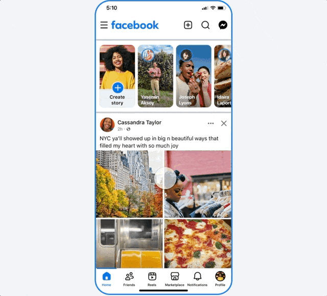 Förenklad navigering där Reels, vänner, Marketplace och profilen lyfts fram i menyn.
