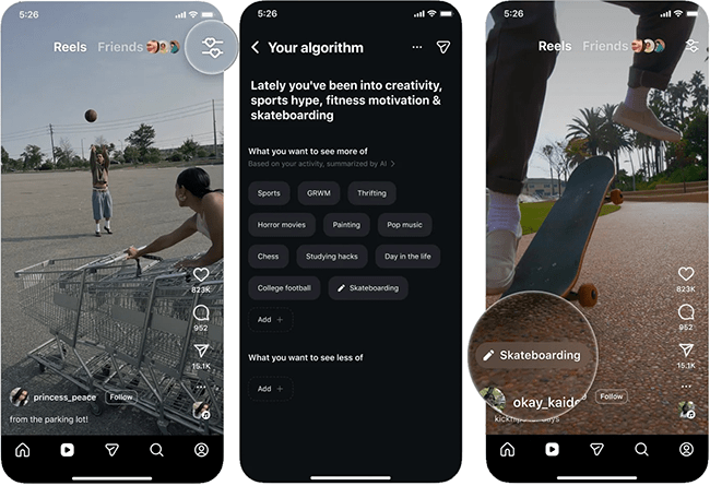 Instagram ger nu användare i USA möjlighet att justera rekommendationsalgoritmerna för Reels. Användare kan se vilka teman appen tror att de gillar, justera vad de vill se mer eller mindre av och dela sina intressen med andra. Funktionen rullas först ut i USA innan den blir tillgänglig för alla användare med engelska som språk i inställningarna.